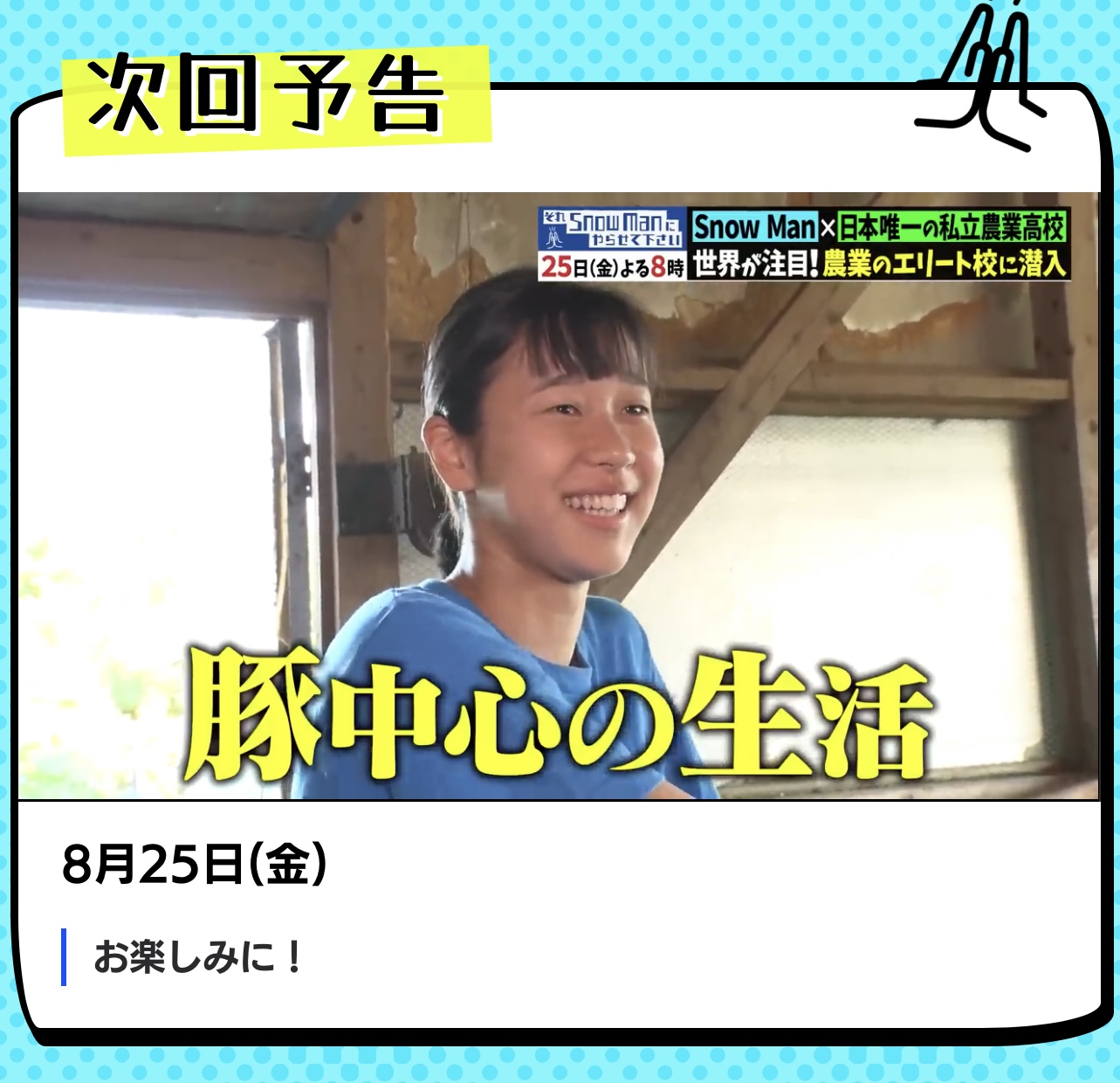 8月25日(金)夜8時から、Snow Man×愛農高校です。バラエティ色強めですが、お時間ありましたらご覧ください。