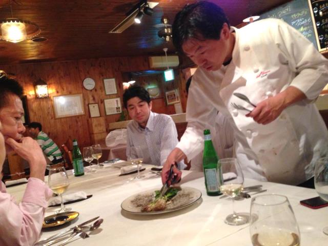 料理中盤から奥田シェフ登場で、新作の「葱のブーケガルニ」を自ら切り分けてくれます。料理は全部で18品とかなりヘビーでした。なので私が興味ある肉のみご紹介します。その前に柏葉さんが持ってきた卵でささっとカルツォーネを作ってくれました。これがおいしかった!